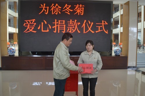 當(dāng)接過公司領(lǐng)導(dǎo)轉(zhuǎn)交過來的36105元愛心捐款時,徐冬菊的淚水禁不住流下臉頰。這是近日發(fā)生在康平納集團感人的一幕。 徐冬菊是康平納毛紡織公司職工,家里有需要贍養(yǎng)的老人及兩個上學(xué)的孩子,2012年9月對象被確診患結(jié)腸及淋巴腫瘤,醫(yī)治期間支出的巨額費用,對于本已經(jīng)濟拮據(jù)的家庭來說,簡直是雪上加霜。 病魔無情人有情,2012年10月康平納集團啟動“愛心幫扶基金”對陳冬菊進行幫扶,然而面對源源不斷的巨額費用,她的壓力可想而知。2013年4月23日集團總公司倡議并開展了為陳冬菊現(xiàn)場捐款活動,在集團董事長陳隊范的帶動下,全體職工積極響應(yīng),無論是朝夕相處的,還是素未謀面的,都紛紛伸出授助之手為陳冬菊獻出自己的一份愛心,展示了“一人有難八方幫,共同援手顯真情”的感人場面。 命運無情,人間有愛。此次捐款活動只是一個插曲,從看望駐地村孤寡老人,到出資支持駐村小學(xué)建設(shè);從看望聾啞兒童,到捐資助學(xué);從幫扶公司困難職工,到為華源礦難、玉樹地震、汶川地震、舟曲特大泥石流等災(zāi)害積極捐款,康平納集團愛心奉獻一直在繼續(xù)……