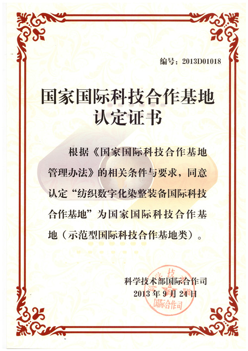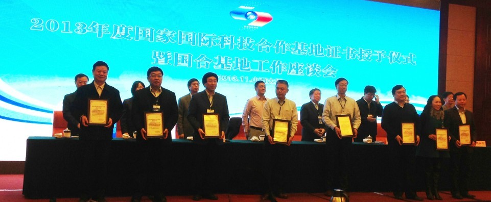 11月30日,2013年度國(guó)家國(guó)際科技合作基地證書(shū)授予儀式暨國(guó)合基地工作座談會(huì)在山西太原舉行。科技部曹健林副部長(zhǎng)出席了國(guó)合基地證書(shū)授予儀式,并就國(guó)際科技合作發(fā)表重要講話。科技部國(guó)際合作司司長(zhǎng)靳曉明等領(lǐng)導(dǎo)出席會(huì)議。山東康平納集團(tuán)公司被授予“紡織數(shù)字染整裝備國(guó)際科技合作基地”。集團(tuán)董事長(zhǎng)陳隊(duì)范(上圖左二)參加會(huì)議并領(lǐng)取基地證書(shū)。